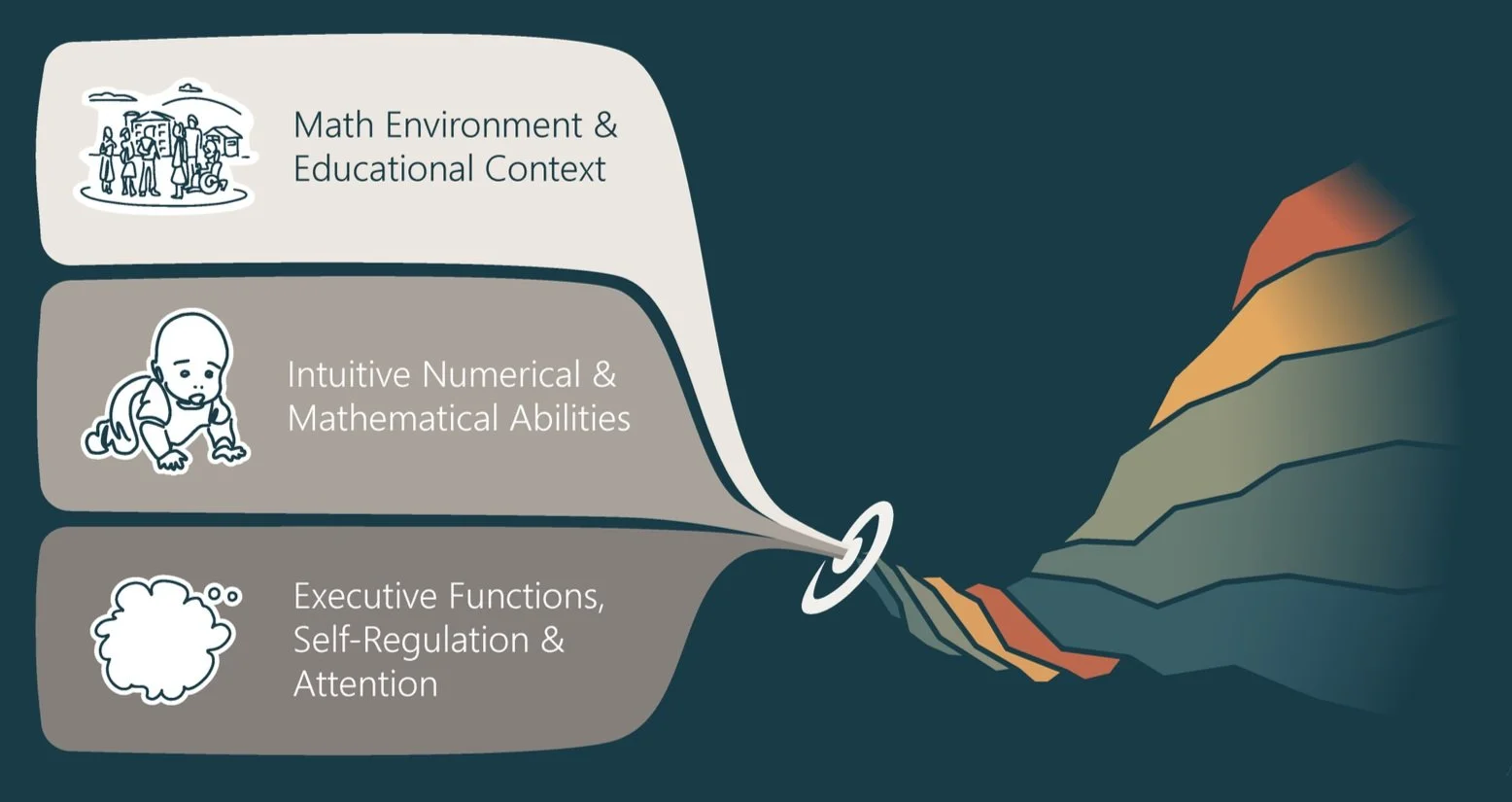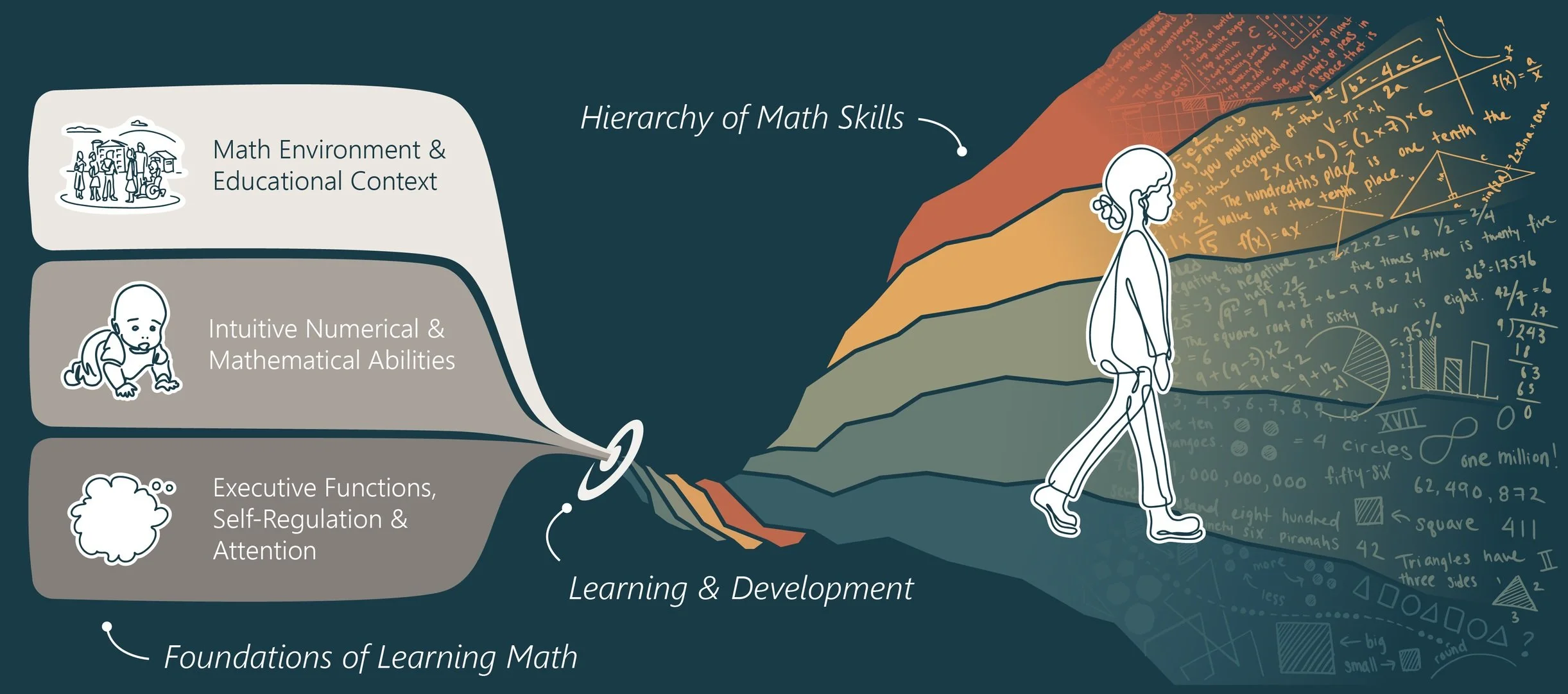 The development of math skills relies on a strong foundation at the level of the individual and their environmental context. Each individual combines intuitive numerical and mathematical abilities that come online very early in development (such as estimating the number of items in a set in early infancy) with higher-order cognition that develops over time (like working memory, attention, and self-regulations skills) to accomplish mathematical thinking. This process relies on a supportive environment where children learn language, symbolic numbers, and formal math concepts from their family, community, and schools. Our research focuses on these elements as the foundations of successful math learning.